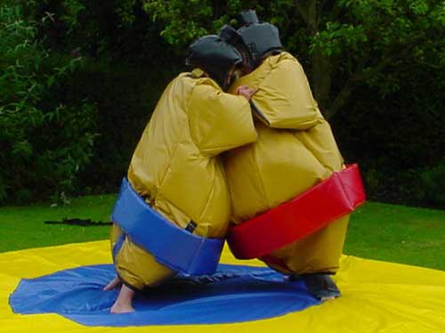 The foam packed Super Sumo Suits will make you the size of a huge clumsy Japanese wrestler. Head protectors, in the style of the traditional Sumo hair cuts are compulsory.